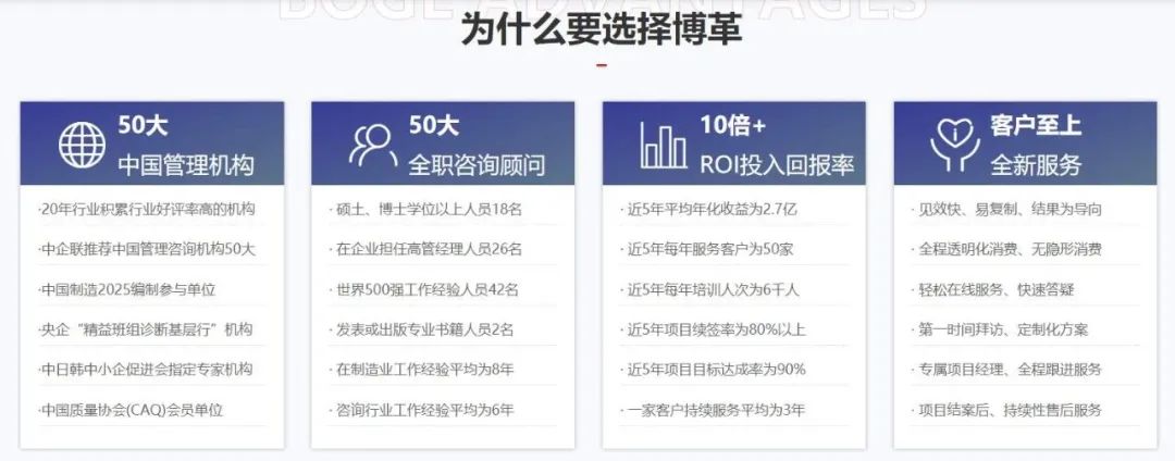 博革結合跨行業、多領域豐富的咨詢經驗,并融合國內企業的特點,設計了博革智造的模型,幫助國內1000+企業實現從精益化到自動化、數字化、智能化的跨越轉變,有效為企業提升核心競爭力,實現智能化生產運營系統的搭建及陪跑,助力企業全面實現卓越運營。博革顧問團隊均來自世界500強企業,如豐田、三星、富士康等,其中多位專家是中國企業聯合會管理咨詢專家、全國六西格瑪推進委員會專家委員;六西格瑪注冊黑帶考試命題專家委員、韓國能率協會、日本能率協會專家。并且博革在全國擁有上百家戰略合作伙伴,其中包含了:自動化、數字化、智能化等各個領域的戰略合作伙伴。