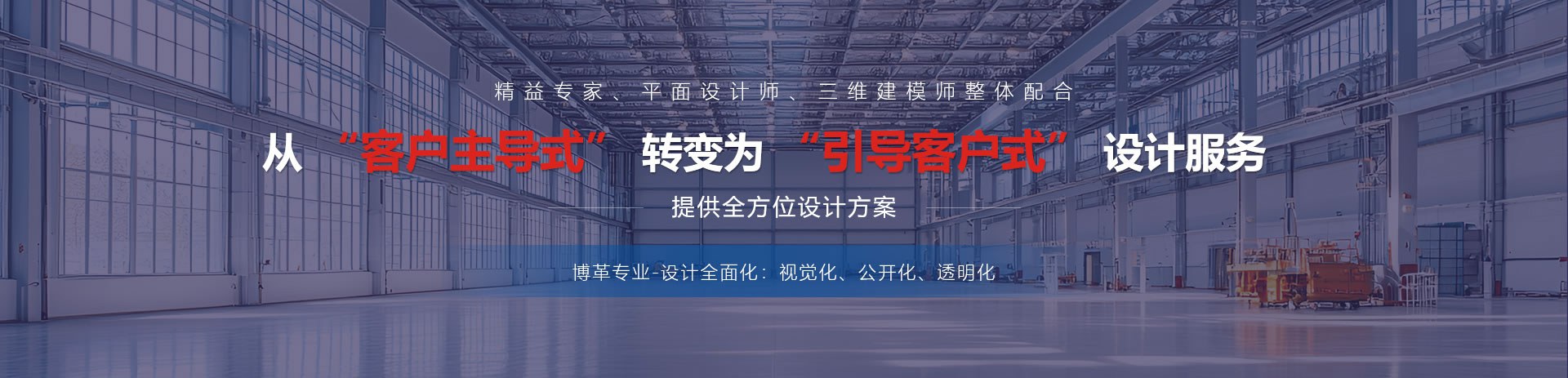 “空間視覺設(shè)計”是由精益專家、平面設(shè)計師、三維建模師整體配合,從“客戶主導(dǎo)式”轉(zhuǎn)變?yōu)?ldquo;引導(dǎo)客戶式”設(shè)計服務(wù),在安全管理、現(xiàn)場管理、參觀展示等多角度,打造『視覺化、公開化、透明化』的工廠的服務(wù)。