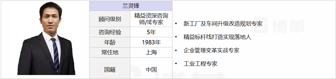 擅長領域:制造管理(精益生產、品質管理、 5S管理、 班組管理、TPM管理等IE改善(新工廠規劃、老工廠車間升級改造/搬遷、物流規劃、七大手法、動作研究、時間研究、LAYOUT設計、線平衡等)