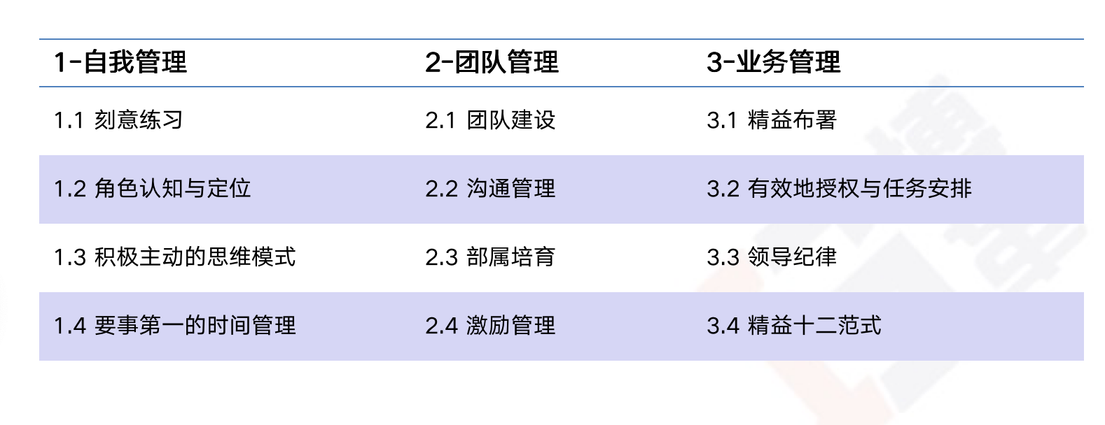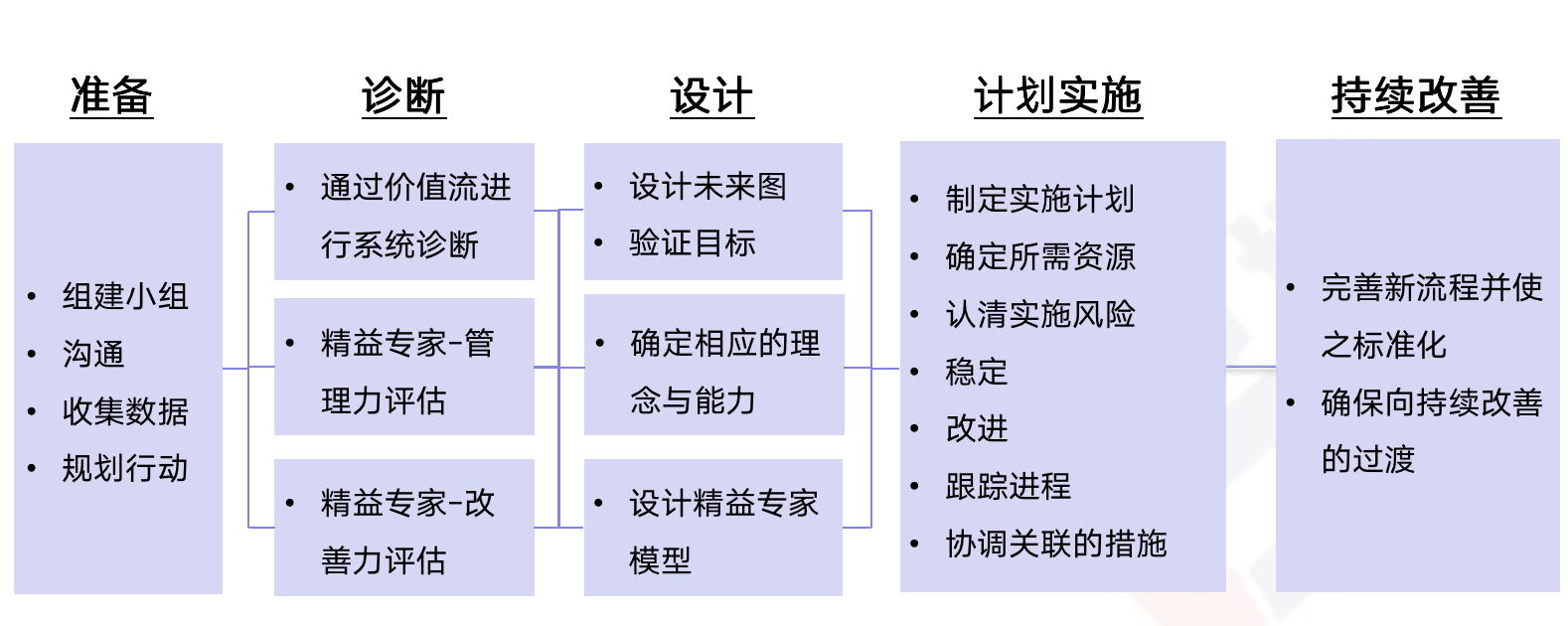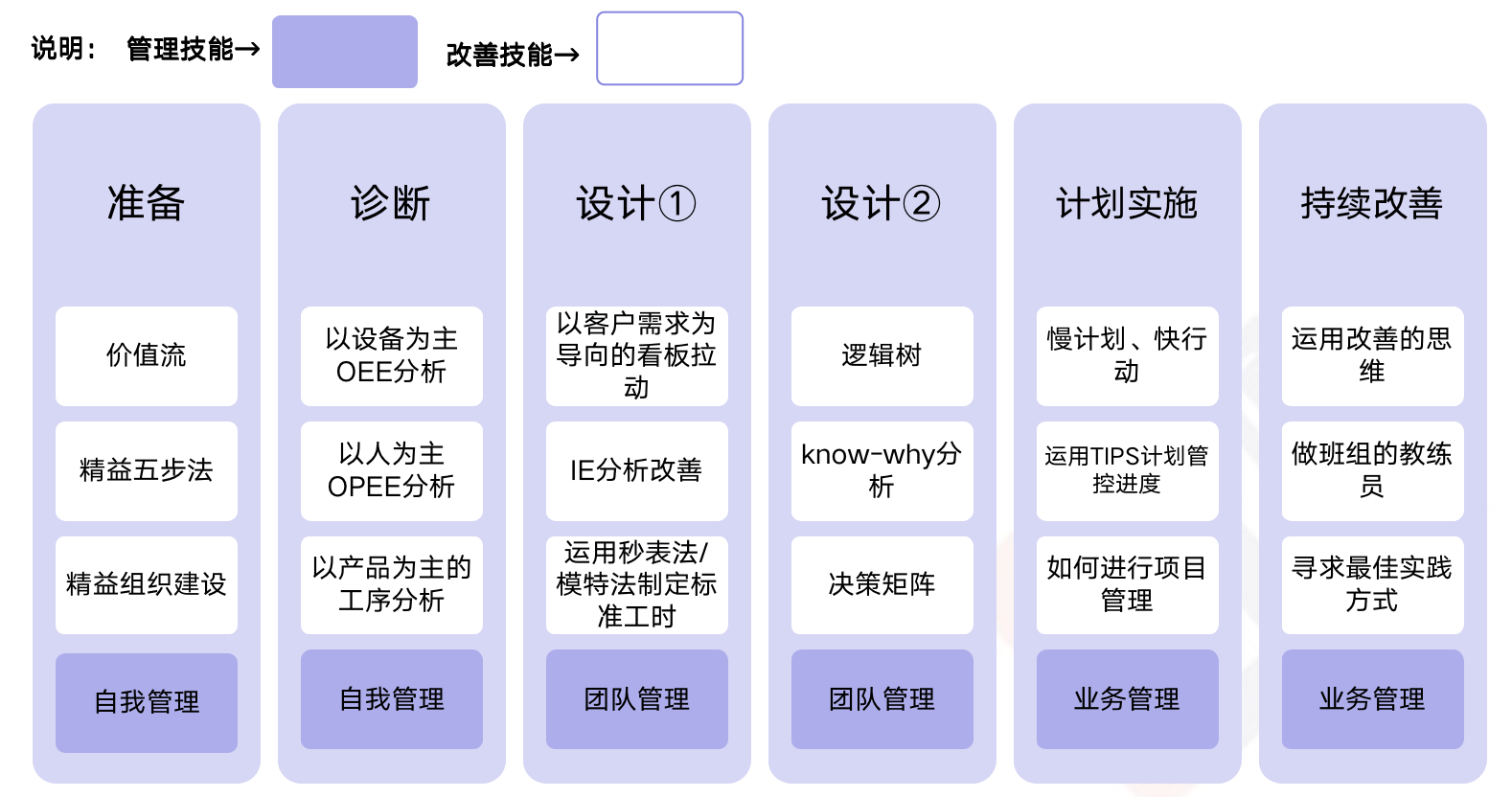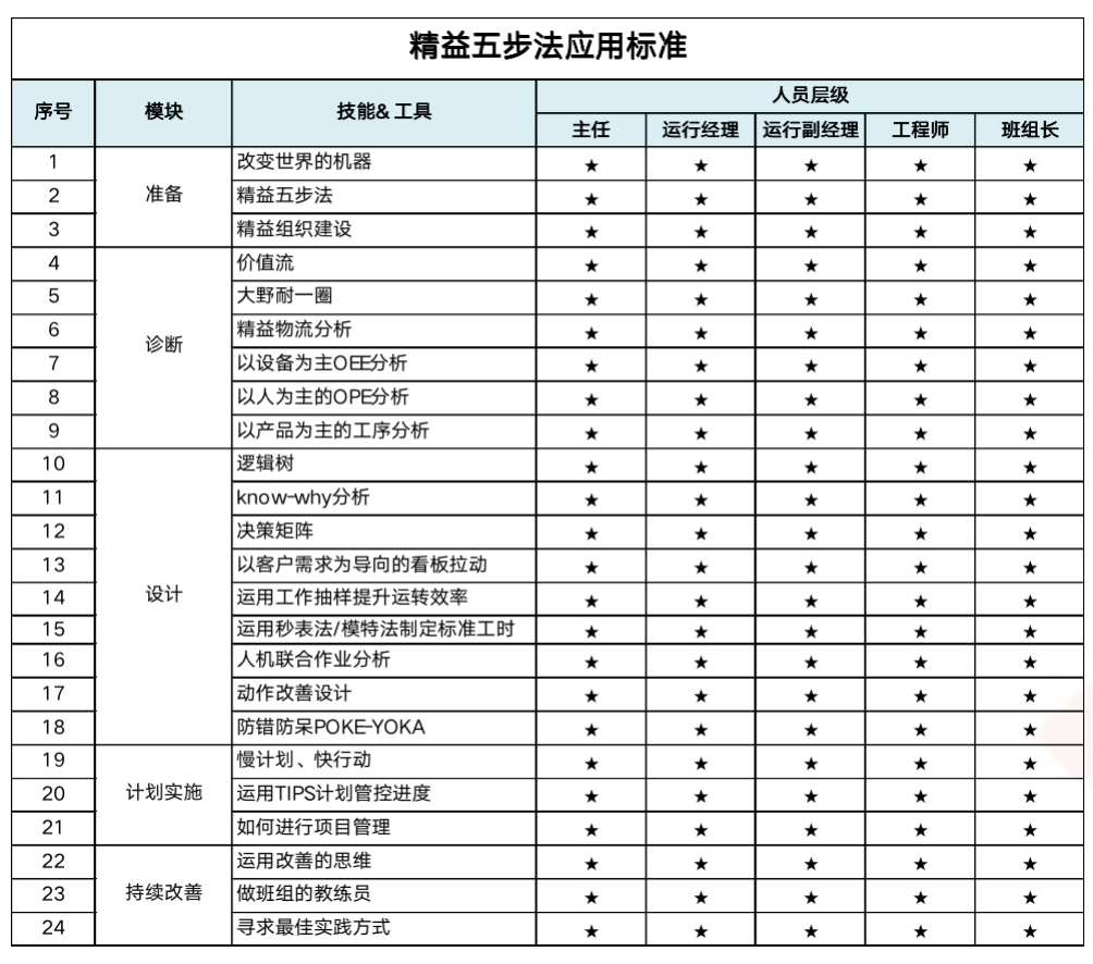 從精益五步法“準(zhǔn)備、診斷、設(shè)計(jì)、計(jì)劃實(shí)施、持續(xù)改善” 和自我管理、團(tuán)隊(duì)管理、業(yè)務(wù)管理等方面,梳理各層級(jí)人員應(yīng)該掌握的技能;