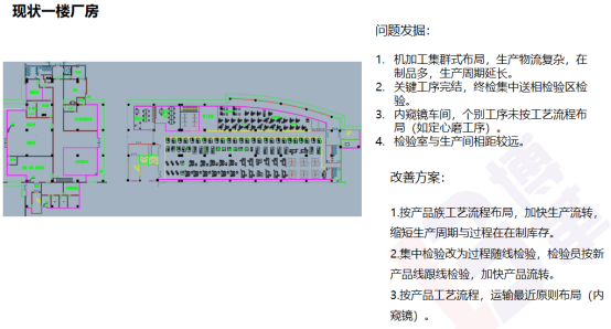 根據(jù)現(xiàn)狀調(diào)查和分析,博革咨詢認(rèn)為,先合理規(guī)劃各樓層功能,再打造連續(xù)流的生產(chǎn)方式,降低成本金額,核心工作是要縮短生產(chǎn)周期、降低中間WIP,提高生產(chǎn)效率,改善現(xiàn)場環(huán)境。