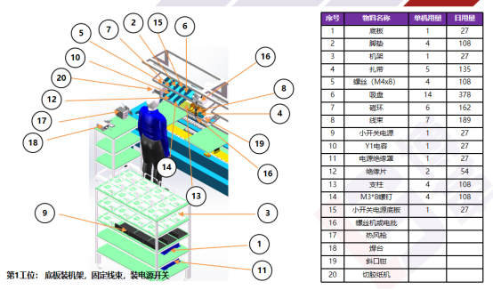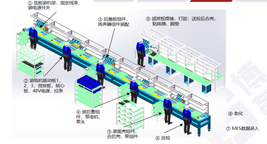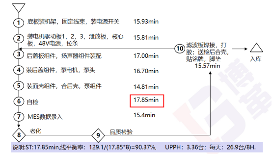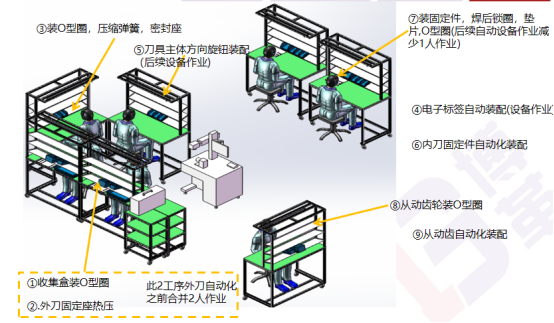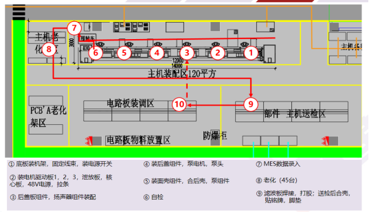 通過連續(xù)流布局,配配用設(shè)備嵌入生產(chǎn)線,減少生產(chǎn)斷點(diǎn)與搬運(yùn),斷點(diǎn)由12降到3個,生產(chǎn)過程搬運(yùn)距離由860米降到60m