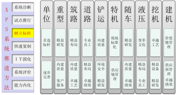 XPS根據A集團及所處行業(yè)的特點,在A集團的十二五戰(zhàn)略目標為愿景,制定了世界級企業(yè)關注的5大目標,工程機械行業(yè)運營中最重要的12大模塊,提煉出58項要素和235項要求。