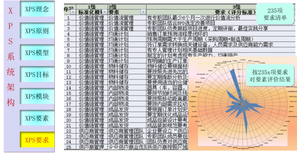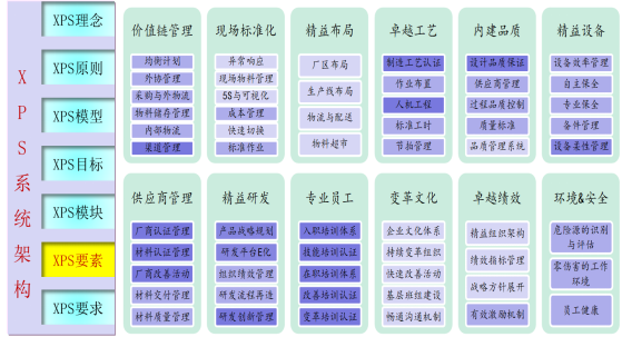 XPS持續(xù)變革系統(tǒng)分別從理念,原則,模型、目標、模塊、要素。要求等七個方面進行規(guī)劃和建模。既有深度,又有廣度,同時,建立評價要素和實施要求,也達到了集團戰(zhàn)略要求迅速推進精益變革的戰(zhàn)略要求。