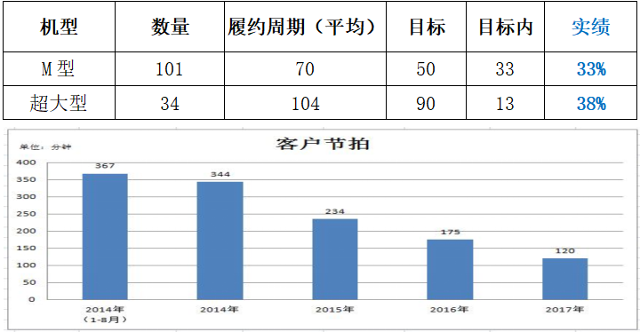 分析當前數據,此兩款產品交付履約率分別為33%和38%,無法滿足客戶需求,且根據公司發展目標和客戶未來需求預測,未來4年,客戶生產節拍將由367分鐘降低至120分鐘,因此通過價值流分析,縮短產品交付周期提高訂單準時履約率成為迫切需要解決的一大問題。