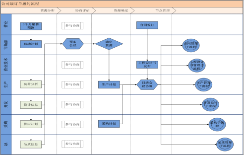 1)計劃整合運營:通過部門別現有資源分析、計劃樹立所需基礎數據整理、召開預備協調會議(中層)、及計劃確定會議(高層+中層),將銷售計劃、供應計劃、生產計劃整合同步,擬定未來訂單履約流程。