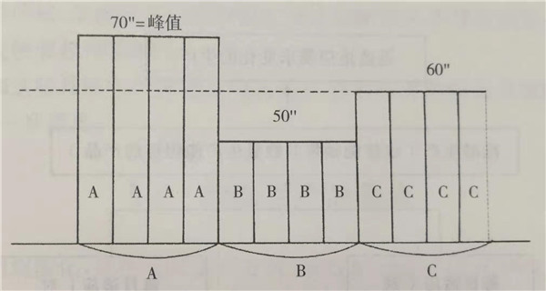 例如,像在圖5.5中看到的那樣,在同一條裝配生產線上某工序的裝配工時產品A是70秒、產品B是50秒、產品C是60秒的情況下,如果按圖中A-B-C一A-B-C的順序流動,在平均節拍時間為60秒的情況下生產線也不會停車,但是像在圖5.6中所看到的那樣,如果所需工時多的產品A成批量演動,在節拍時間為60秒的這條生產線上,作業在節拍時內處理不完,就會發生生產線停車的情況。為了不發生生產線停車,就要像用更短的節拍時間能夠處理70秒高峰作業的產品A那樣,不得不增加人員了。