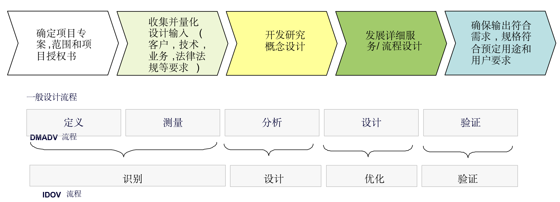 一般設計流程的階段和行為均可以與IDOV或DMADV方法論相對應: