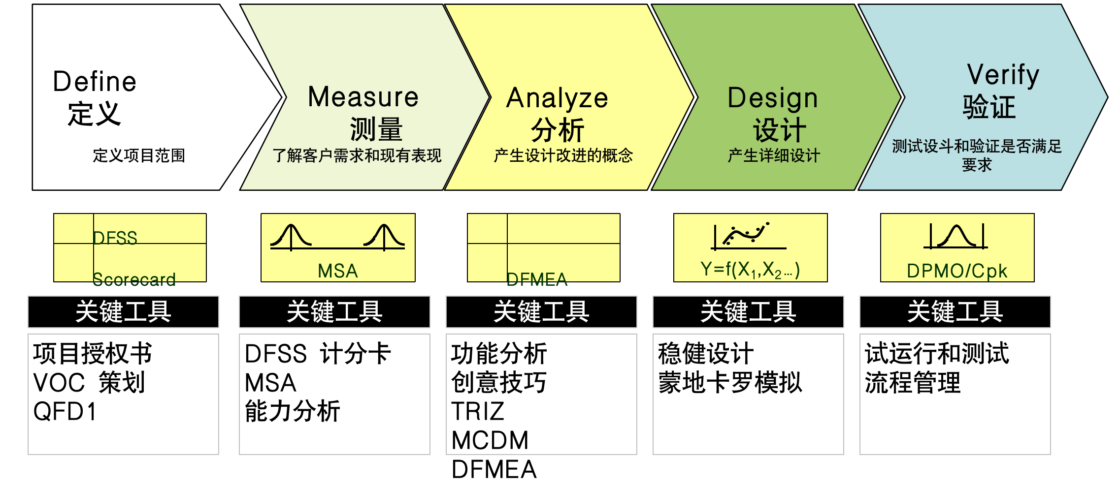 ·六西格瑪設計是一種從被動設計變為主動設計的方法,DFSS從市場和客戶的需求出發,根據總結了前人經驗的方法論體系,運用創新和設計的常用工具,將研發和設計工作變得可衡量、可預測、并可控制。
